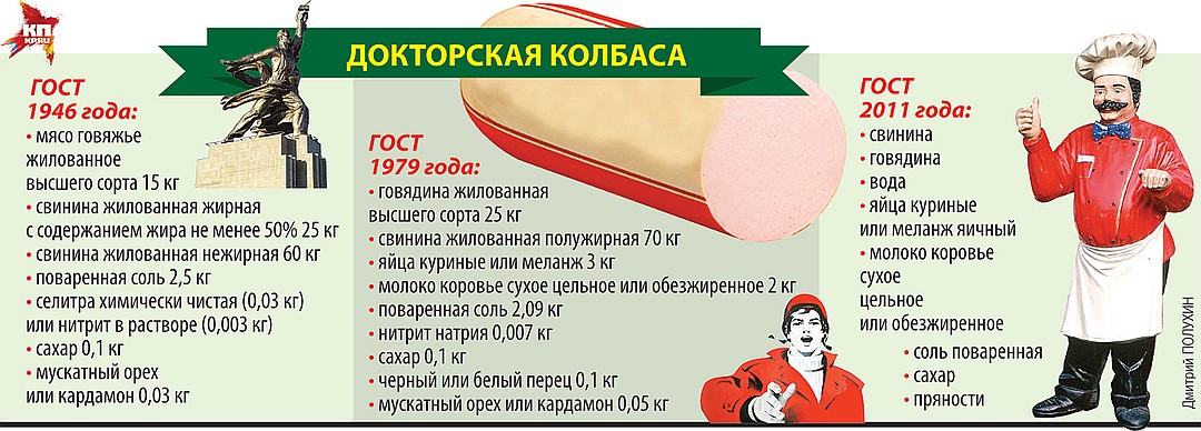 ".. В 70-х годах в СССР на 760 мясоперерабатывающих заводах ежегодно производилось 2,5 млн. т. колбасы. До 1990 года в СССР на человека приходилось более 40 кг колбасных изделий в год, в начале 2000-х этот показатель сократился до 15 кг в год"